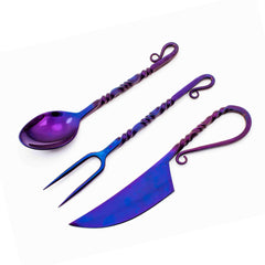 Viking cutlery set hand forged in medieval knot work style rainbow color with Aniline leather sheath