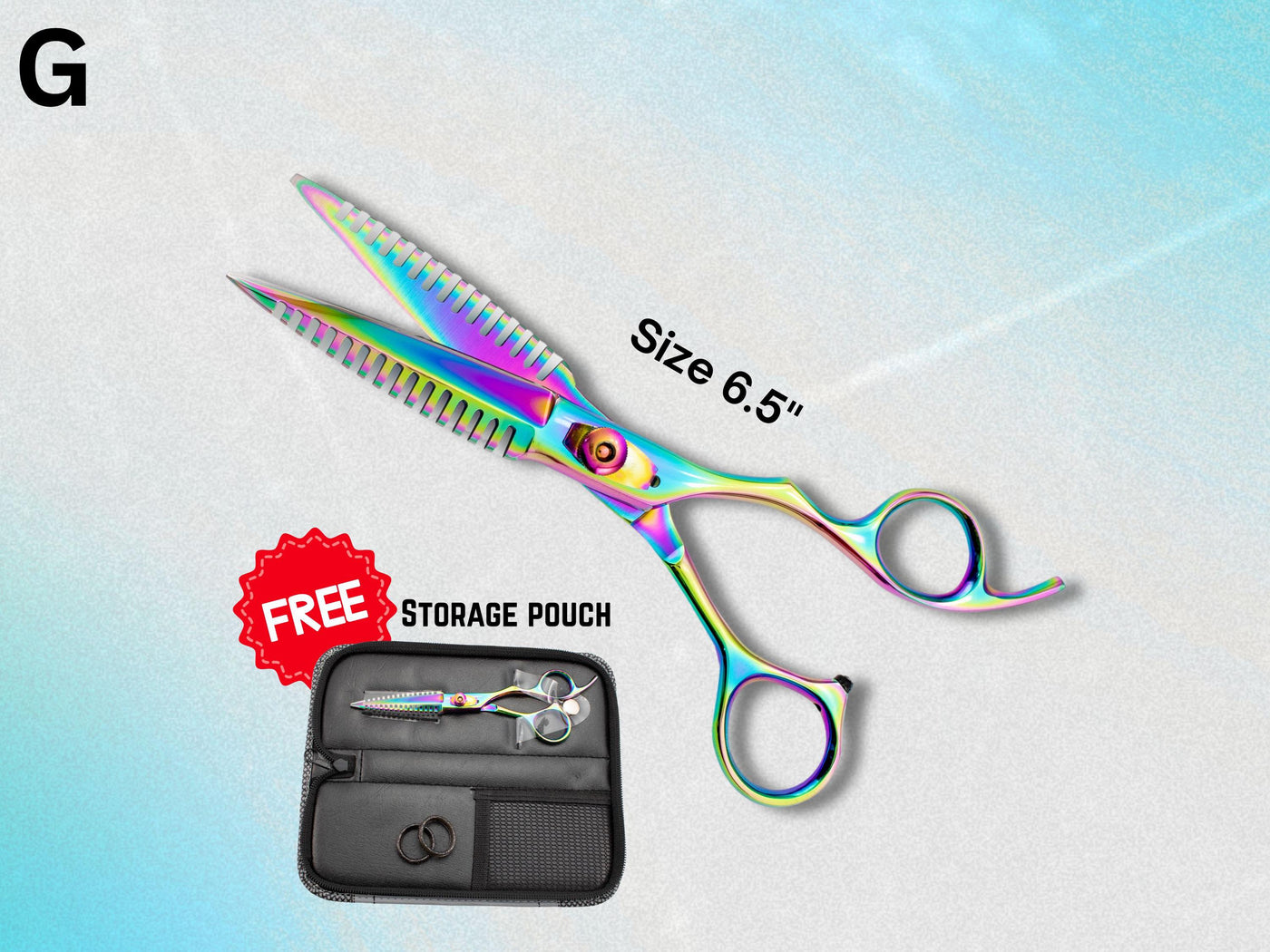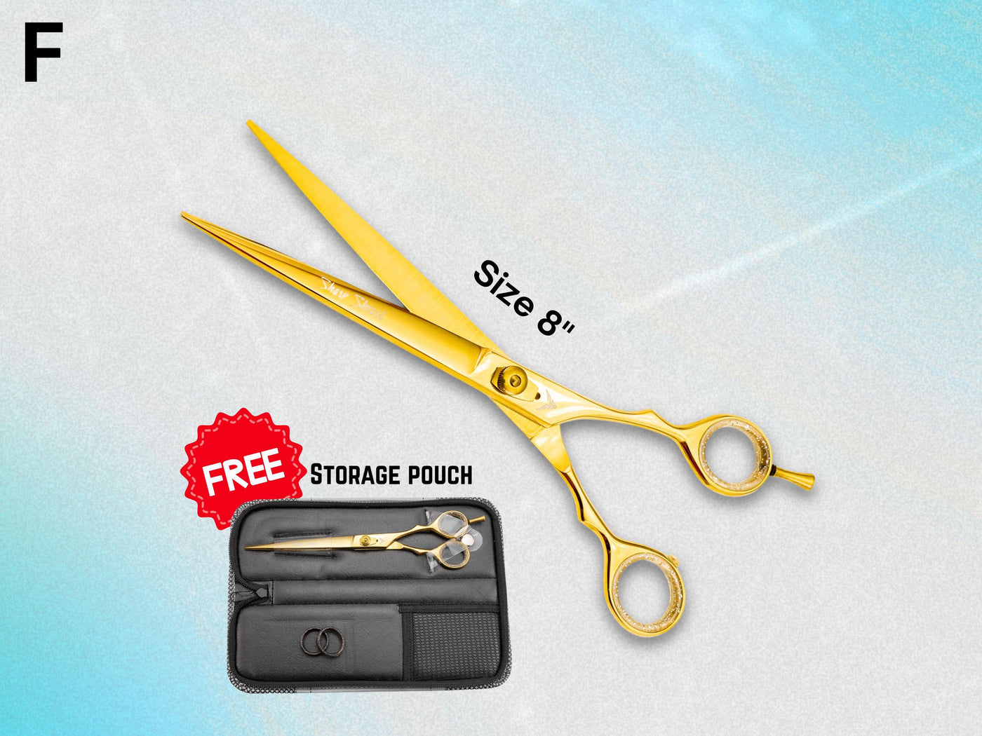 F. Gold Series Large Scissors - 8" Handle large pets easily with Gold Series Large Scissors. The 8" length, adjustable screw, and removable finger rest provide precision and comfort. G. Fish Bone Scissors - Rainbow Color Add flair with Fish Bone Scissors in stunning rainbow color, featuring 6.75" length, adjustable screw, and attached finger rest. Perfect for vibrant grooming!