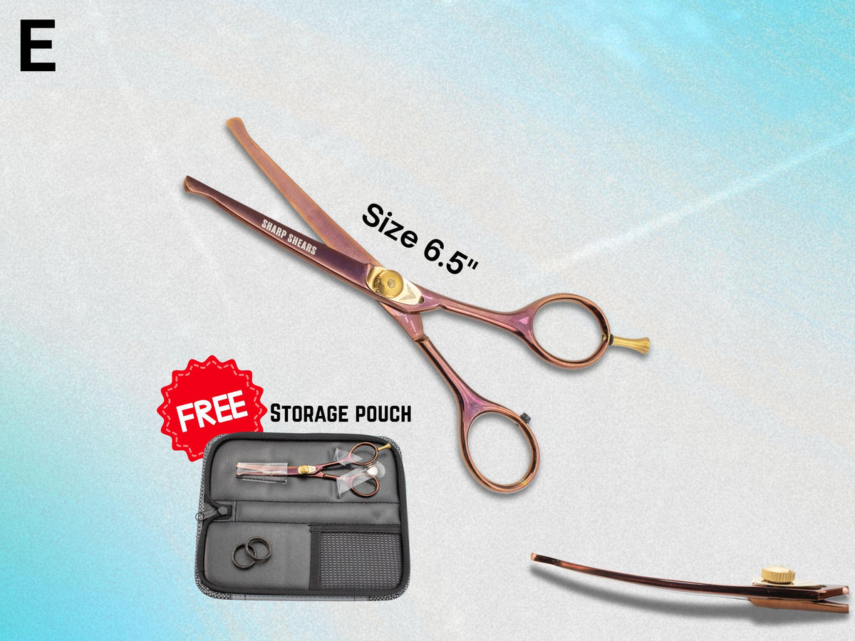 E. Rose Gold Pet Scissors - 6.5" Curved Blade Elegant Rose Gold Pet Scissors with a curved 6.5" blade and adjustable screw for smooth, professional cuts. Removable finger rest for added comfort.
