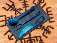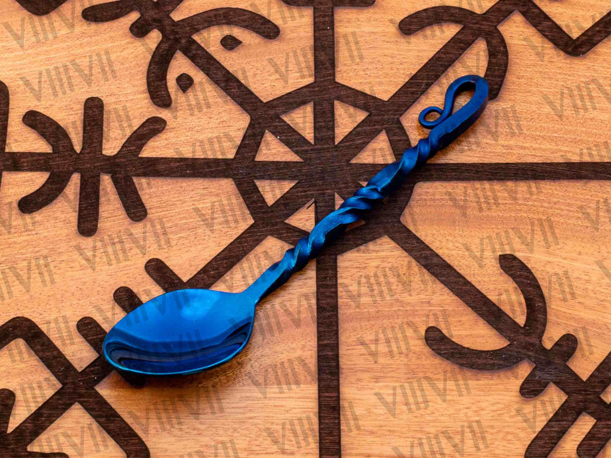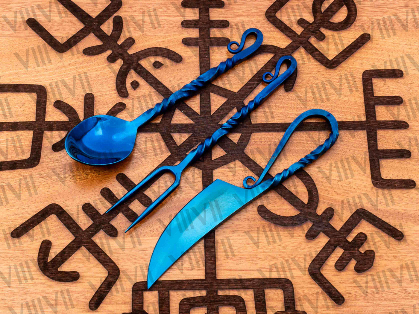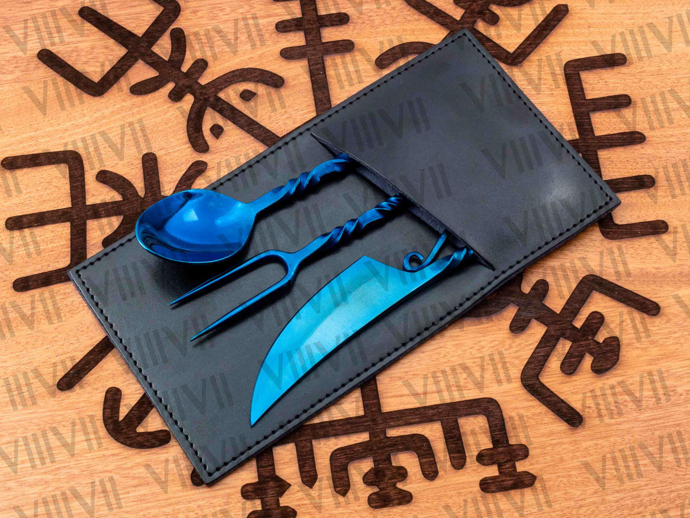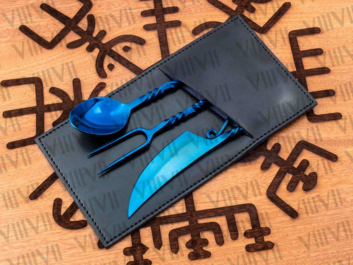 We made this Viking cutlery set using new hand forging methods and high quality materials because old materials Viking set would get rusty and it’s not considered food grade. Food grade stainless steel and modern methods and we use mirror polish which is highly recommended because it’s very hygienic as you can see any stain on item and its dish washer safe. It comes with Aniline leather sheath which is one of best quality leather the most natural, soft and gracefully of all leather types you can use this cutlery set in larp, reenactment, Cosplay or Viking family feast. This Viking set is very elegant and its exquisite design is forged by our seasoned blacksmith. We give life time warranty if our item gets rusty.