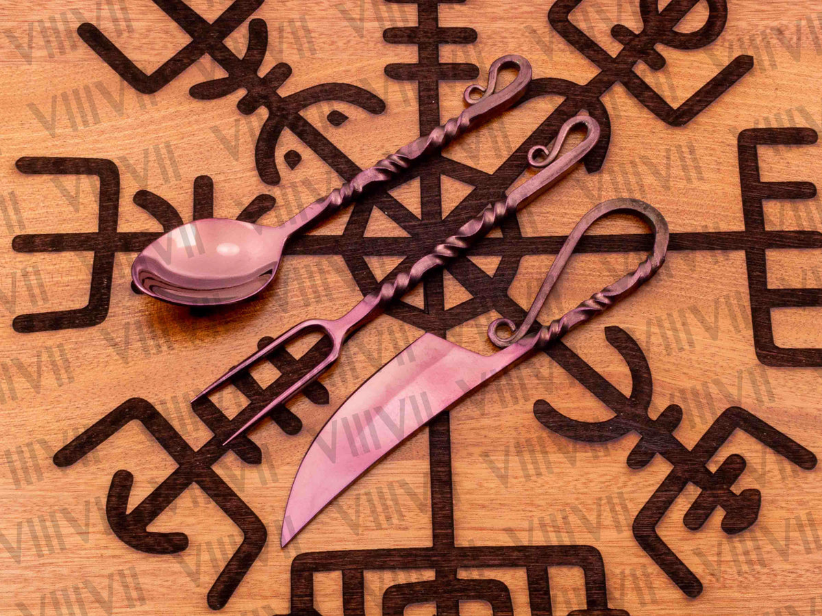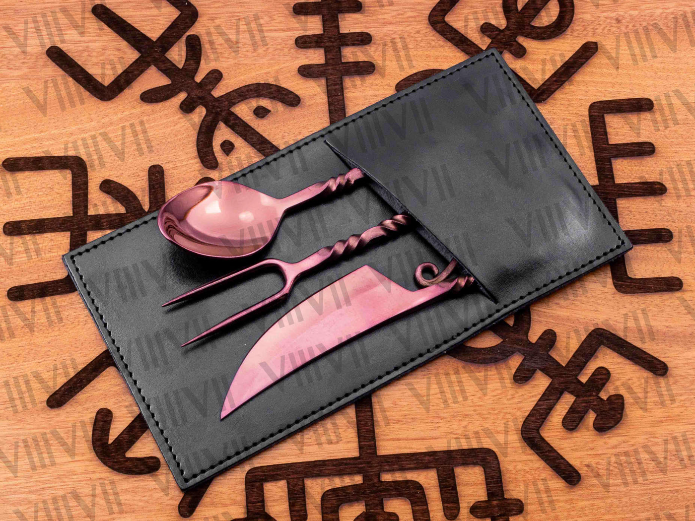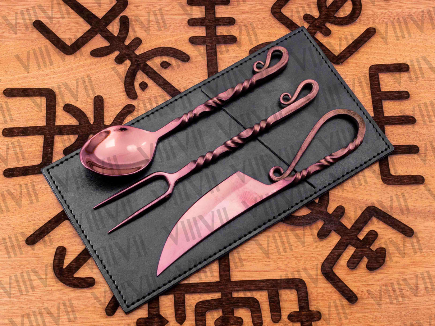 Viking Cutlery set Double twist handle heat treated Rose gold color and Aniline leather sheath