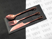 Viking cutlery set hand forged in medieval knot work style in Rose gold color and aniline sheath
