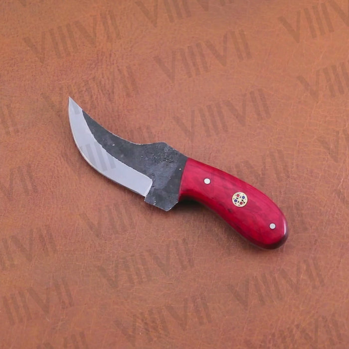 Whether you’re out skinning game, field dressing, or tackling survival tasks, this knife delivers clean cuts and lasting edge retention. The integrated grip hole provides added control, especially during detailed tasks. Its handle is made of deep blood red wood, expertly riveted with brass mosaic pins for durability, comfort, and a stunning visual appeal.