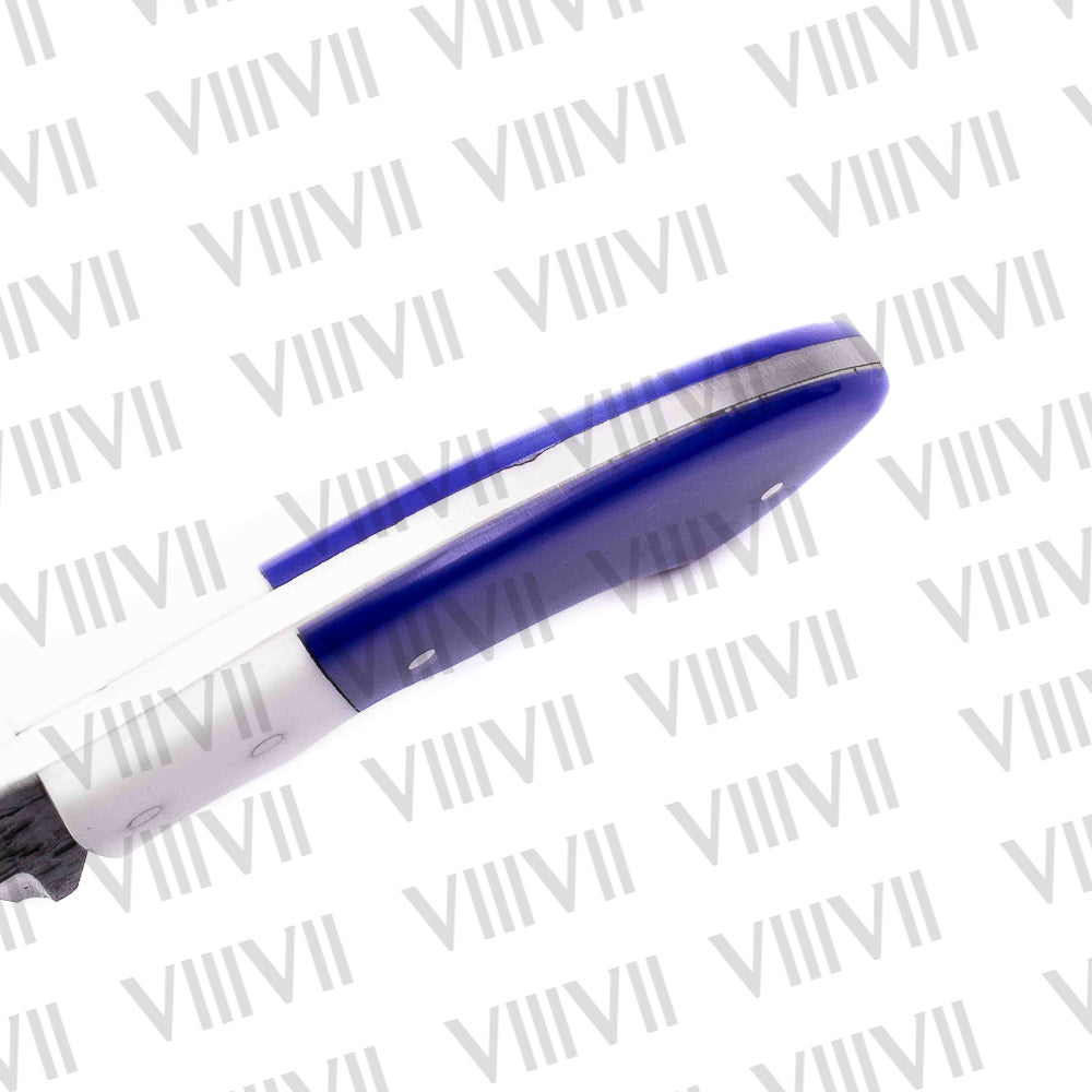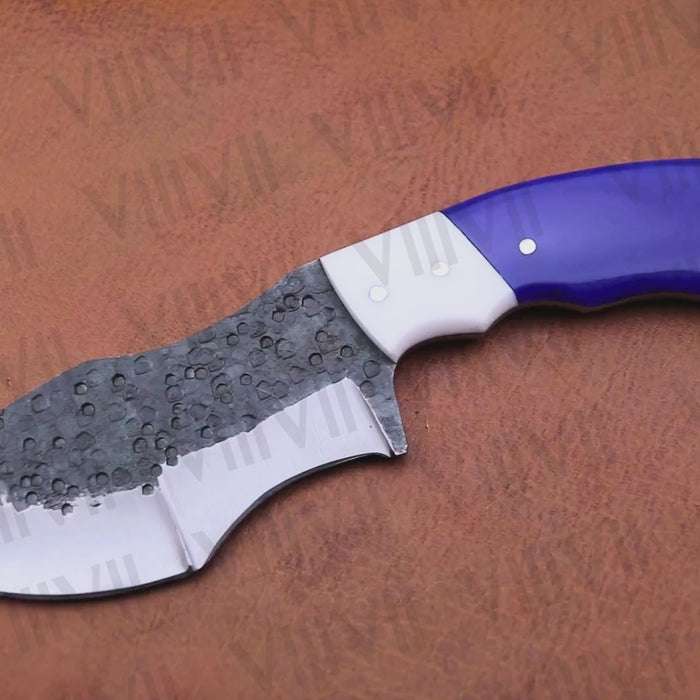 This handmade hunting knife is crafted with a forged stainless steel blade that delivers durability and edge retention without much flex—ideal for clean cuts in the field. The eye-catching purple resin handle is securely riveted along the full tang blade, offering a comfortable and firm grip during use.