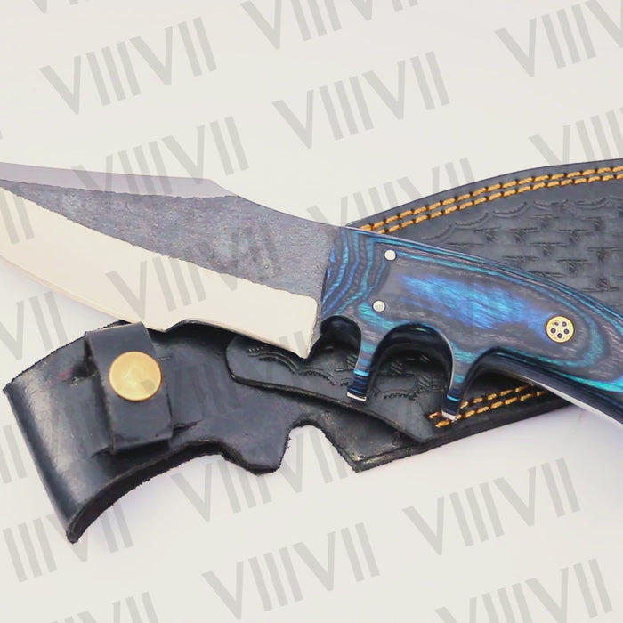 This handmade fixed blade hunting knife is forged from durable D2 stainless steel and paired with a striking blue ashwood handle, offering both beauty and performance. Its full tang construction and tailored point blade make it ideal for skinning, field dressing, and outdoor survival tasks. The ergonomic handle ensures a secure, comfortable grip—even in rugged conditions.