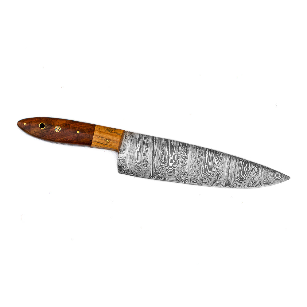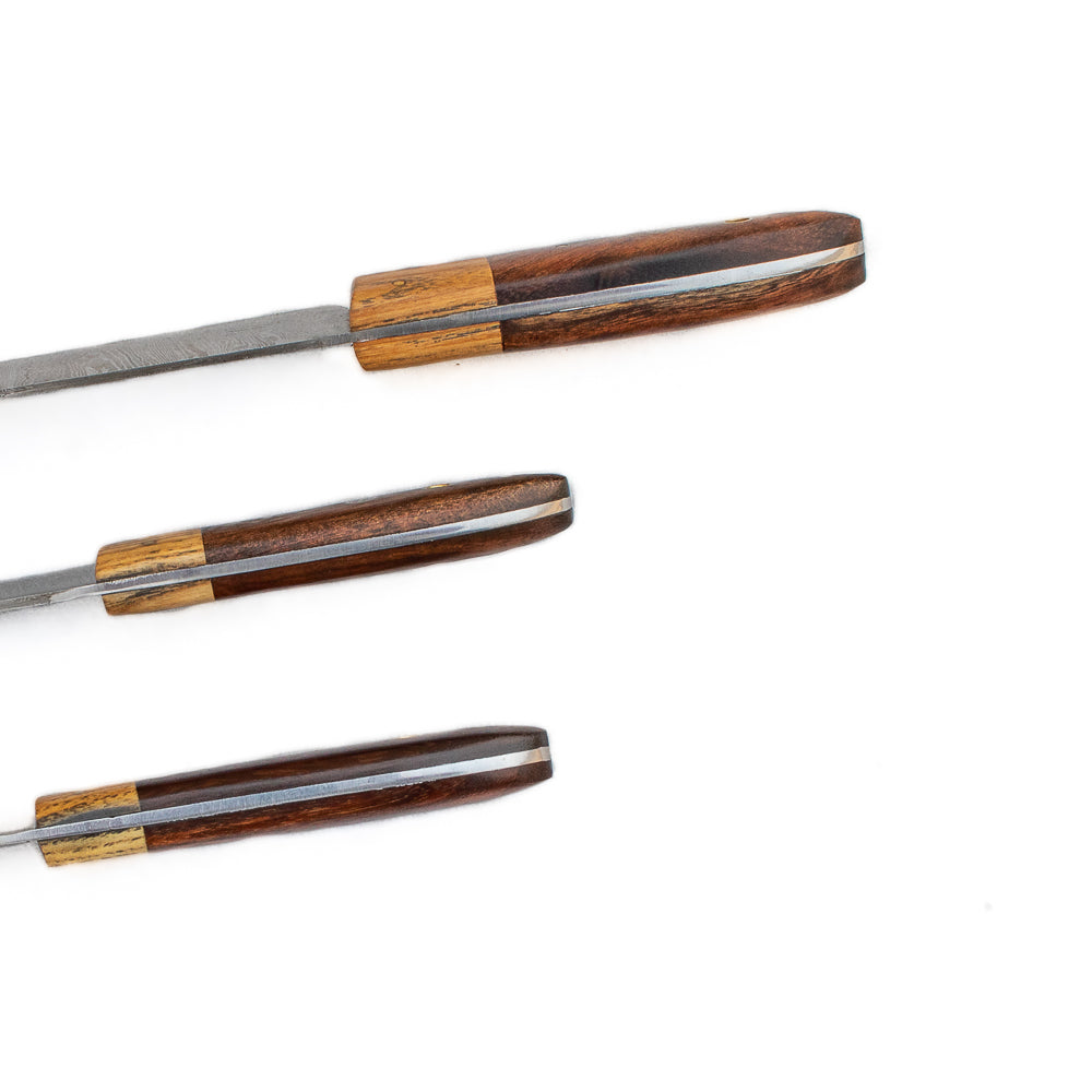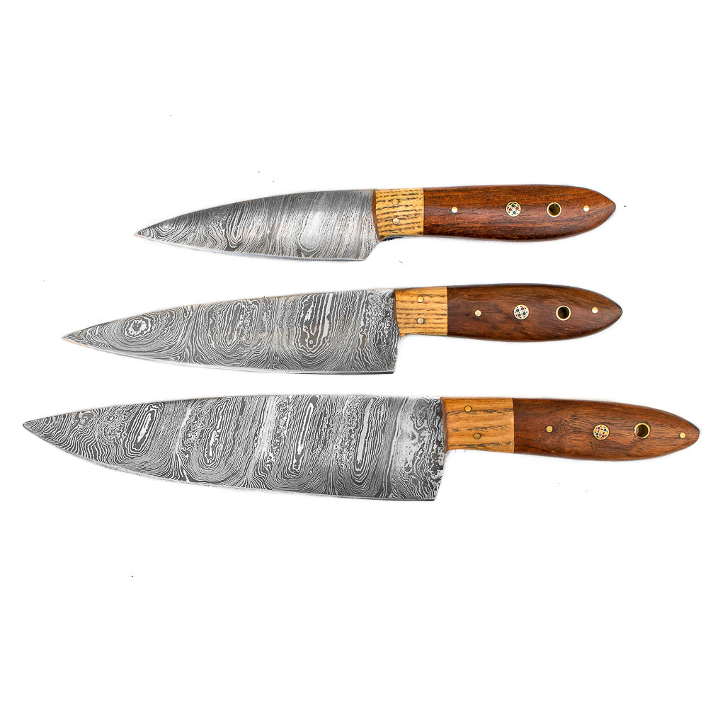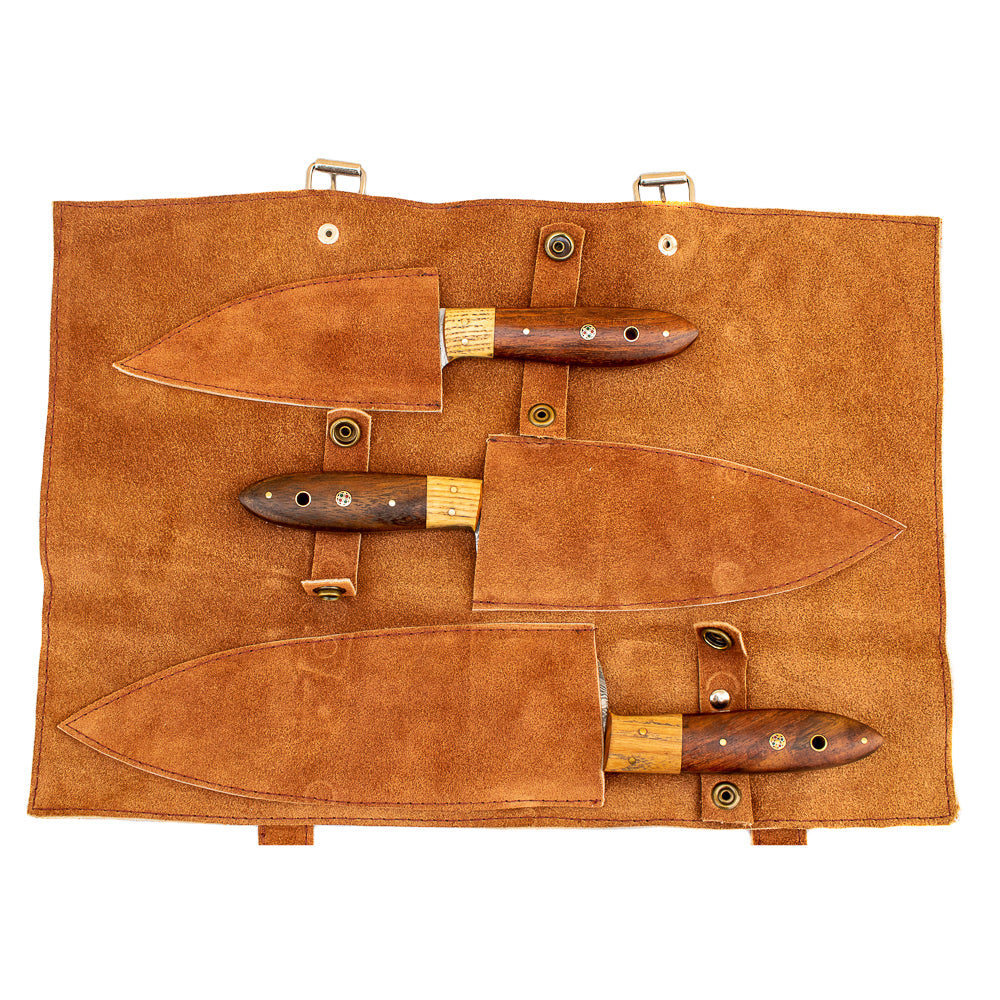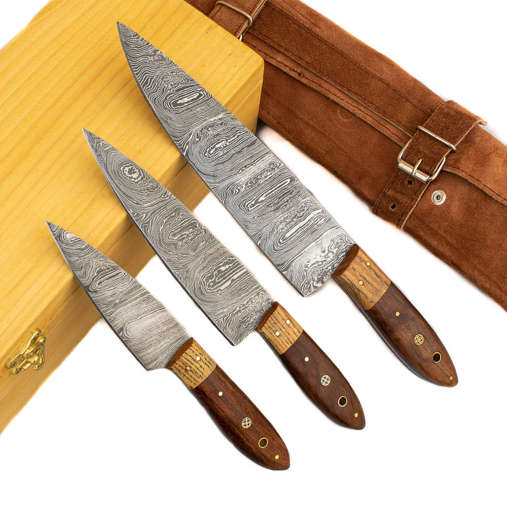 Bring professional craftsmanship to your kitchen with this 3-piece Damascus steel chef knife set, designed for precision, strength, and elegance. Each blade is hand-forged, showcasing the stunning layered Damascus steel patterns, while the rosewood handles comes in suede leather sheath provide ergonomic comfort and timeless beauty. Perfect for professional chefs, passionate home cooks, and collectors.
