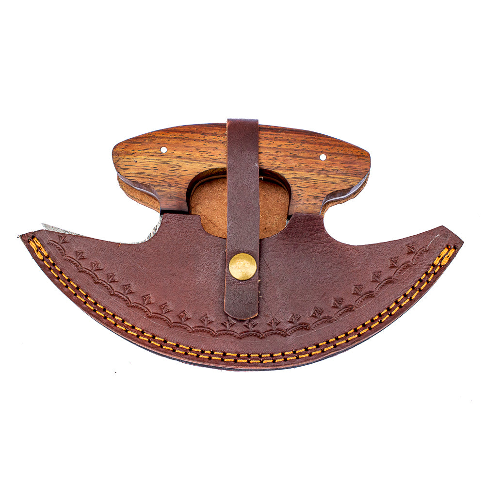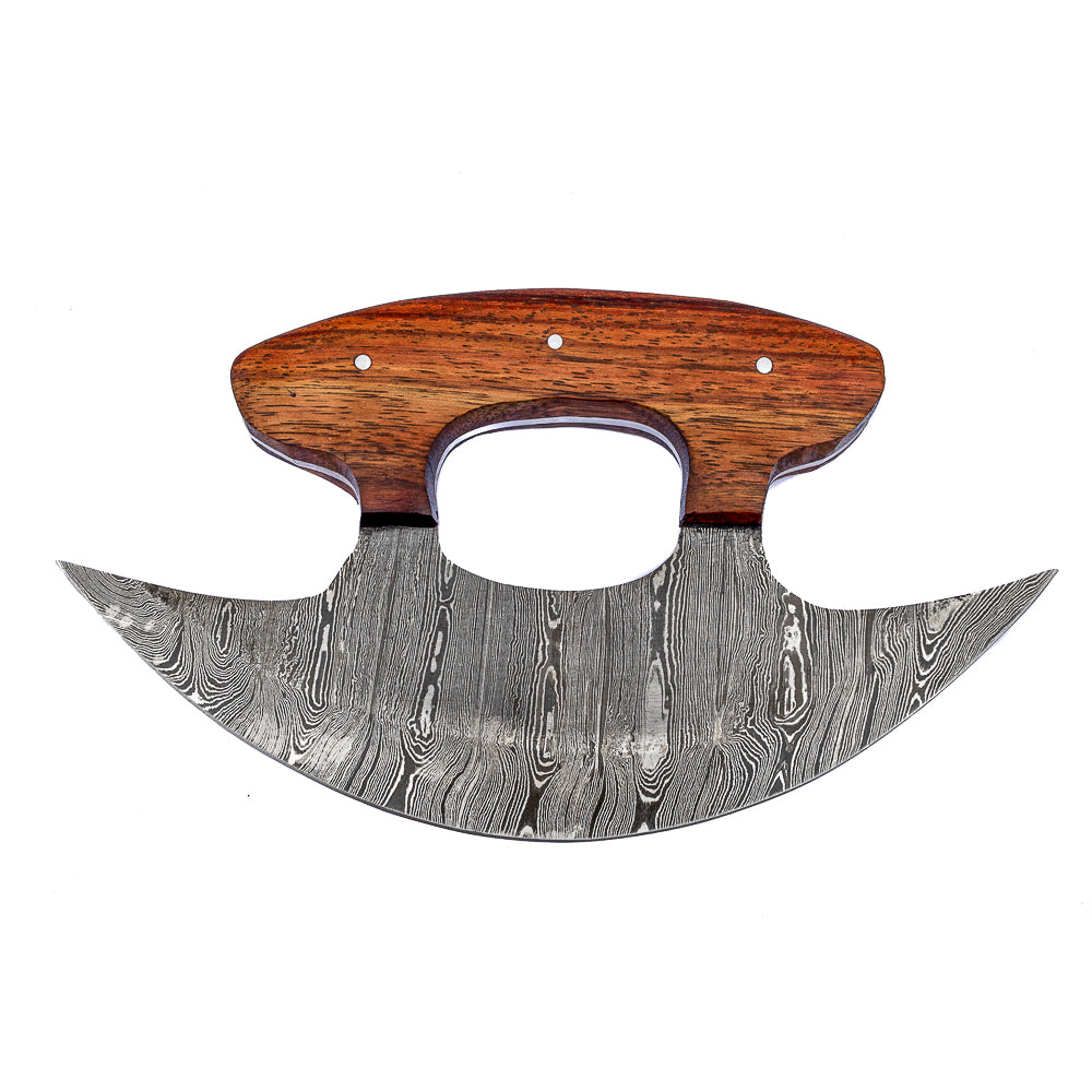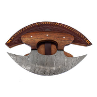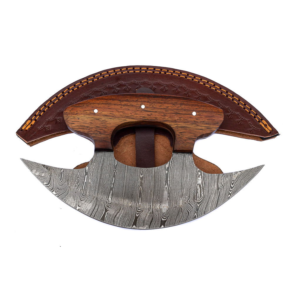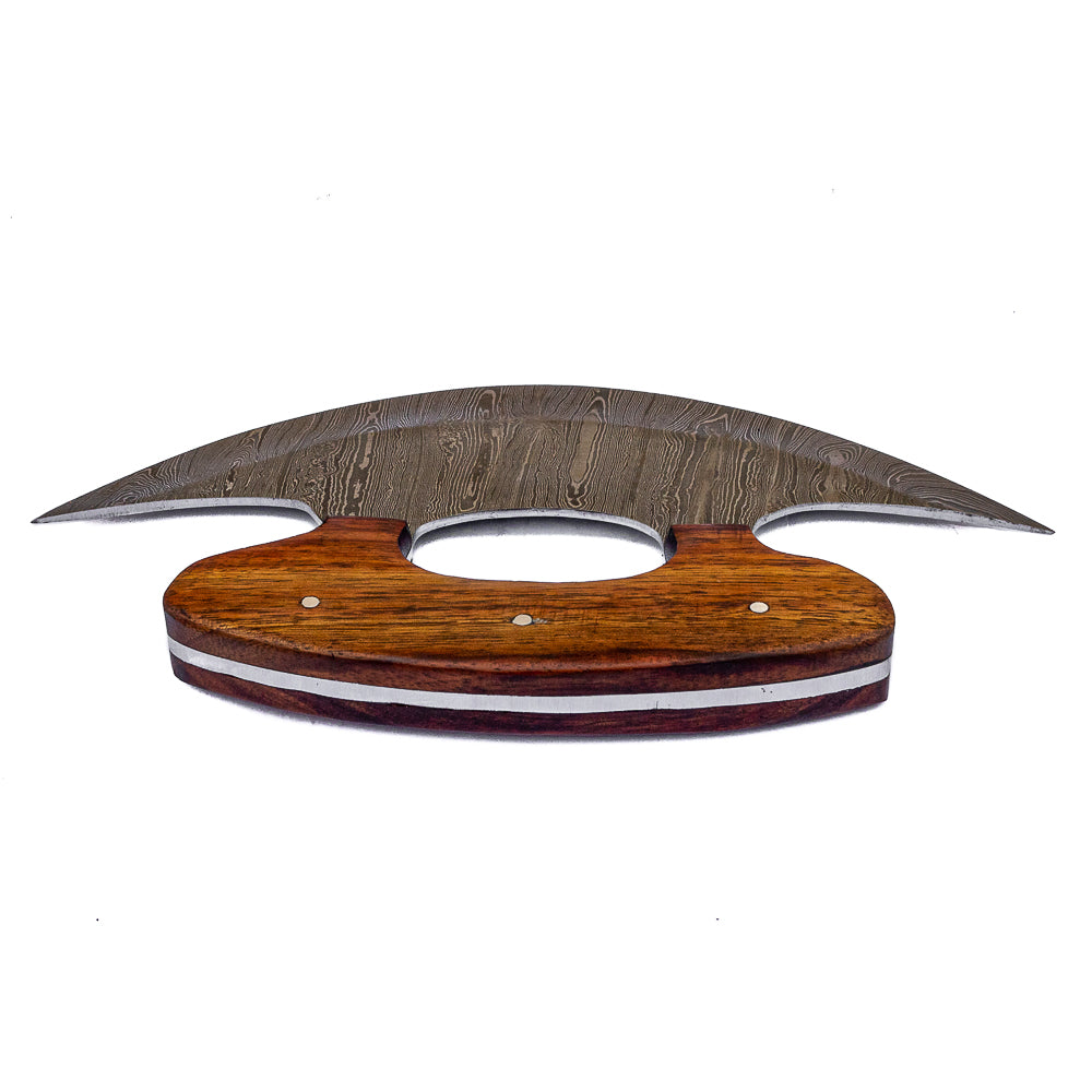 Elevate your kitchen collection with this handmade Damascus steel pizza knife, inspired by the traditional Alaskan Ulu design. With a wide, curved blade and sturdy rosewood handle, it delivers effortless cutting power for pizzas, herbs, meats, and more. A functional tool with artisan craftsmanship — perfect for chefs, home cooks, and gift-giving.