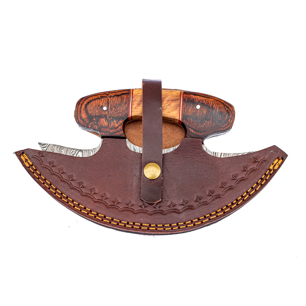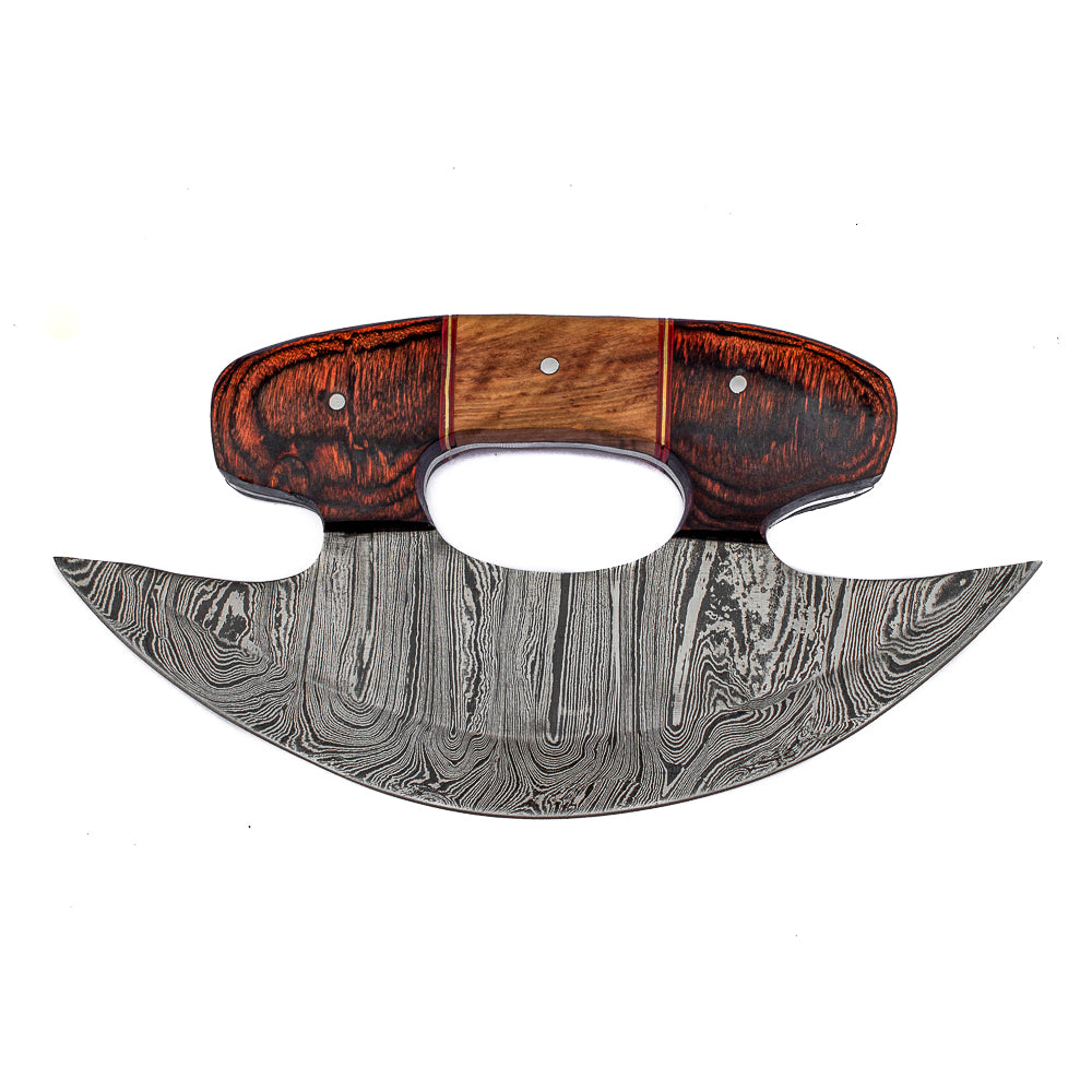 Upgrade your kitchen tools with this hand-forged Damascus steel pizza knife, designed in the traditional Alaskan Ulu style. Featuring a dual-tone handle crafted from Rosewood & Olive Wood, it offers both ergonomic comfort and natural beauty. Its curved blade glides effortlessly through pizzas, herbs, vegetables, and meats — making it a versatile and collectible addition to any kitchen.