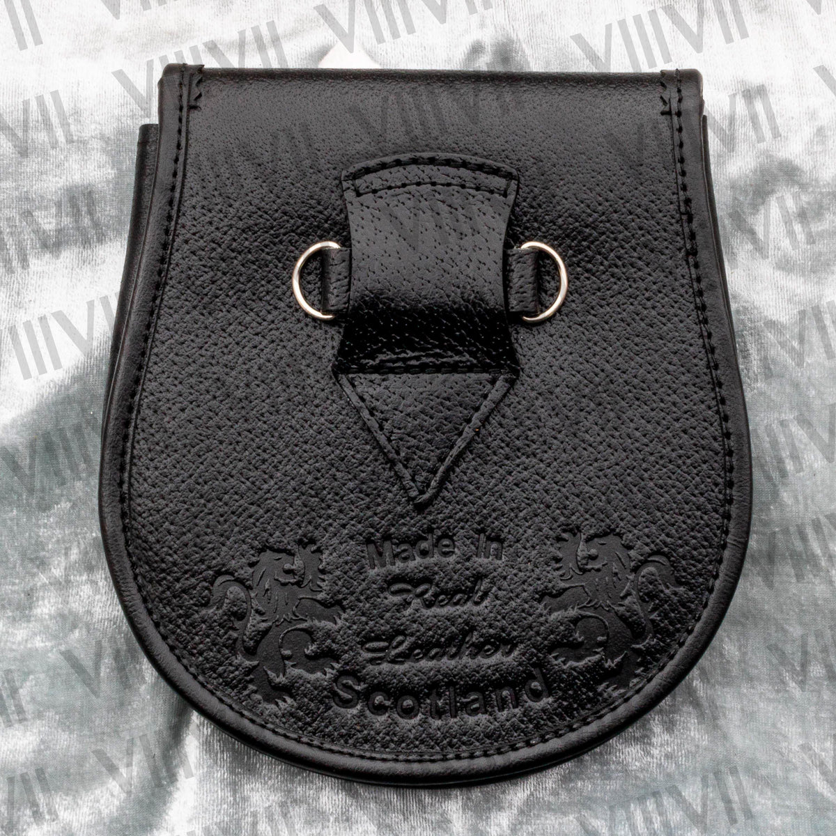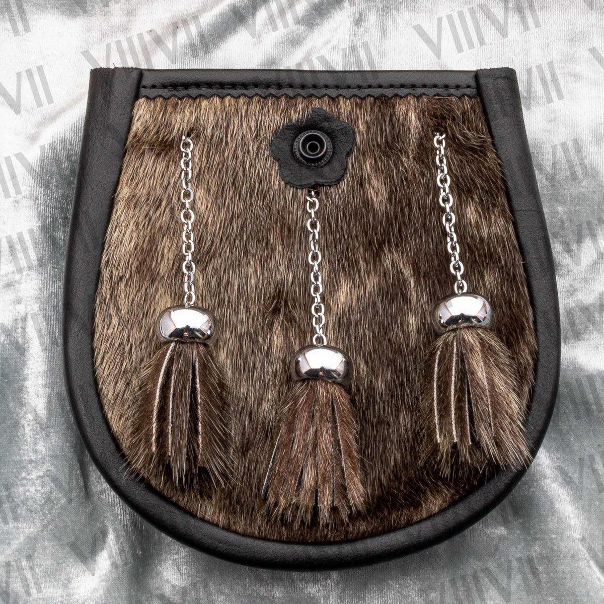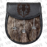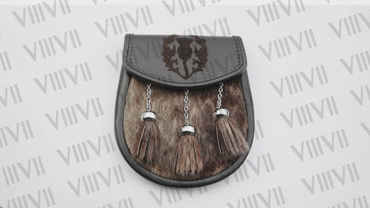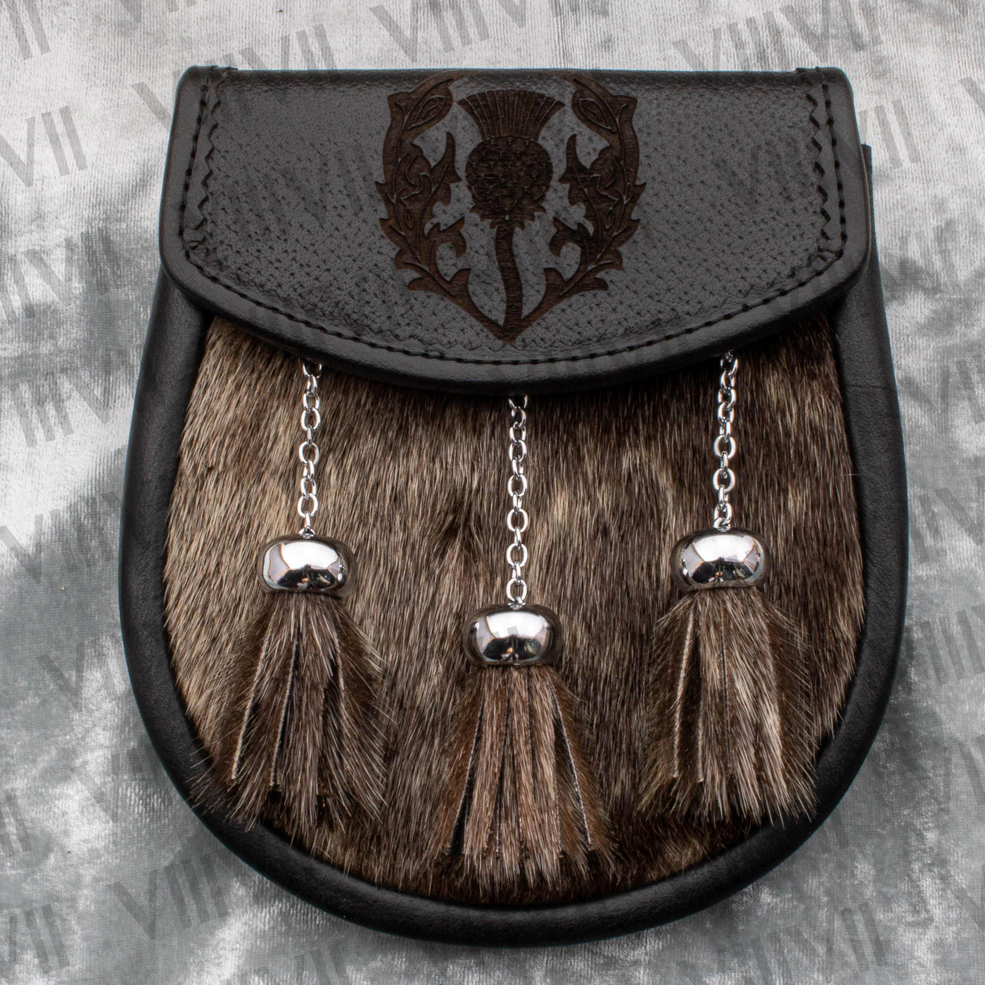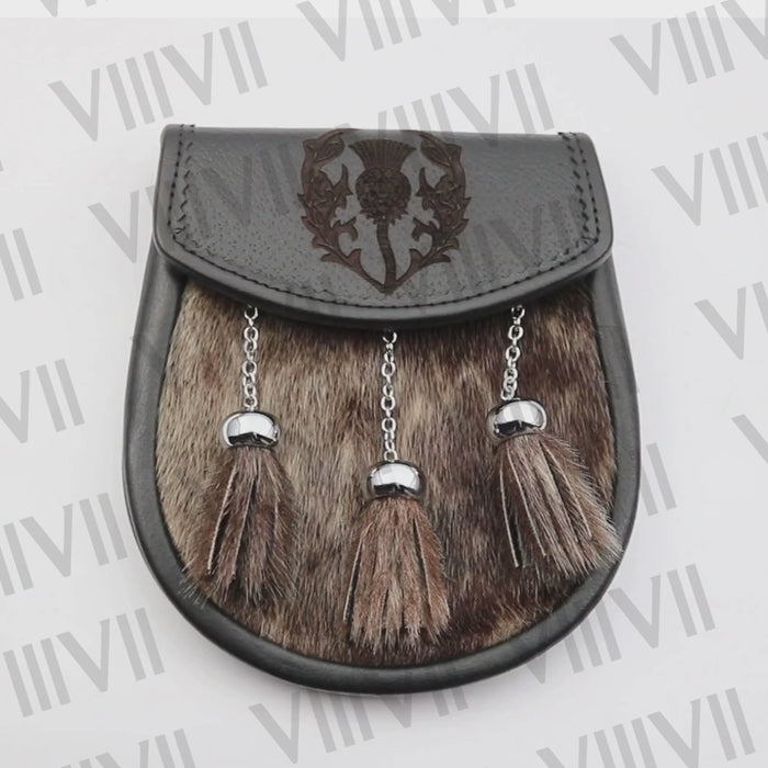 Scottish Seal Skin Sporran with Thistle Engraved Flap, Pig Grain Leather & Three Chrome Tassels Ideal for Highland Games and Events