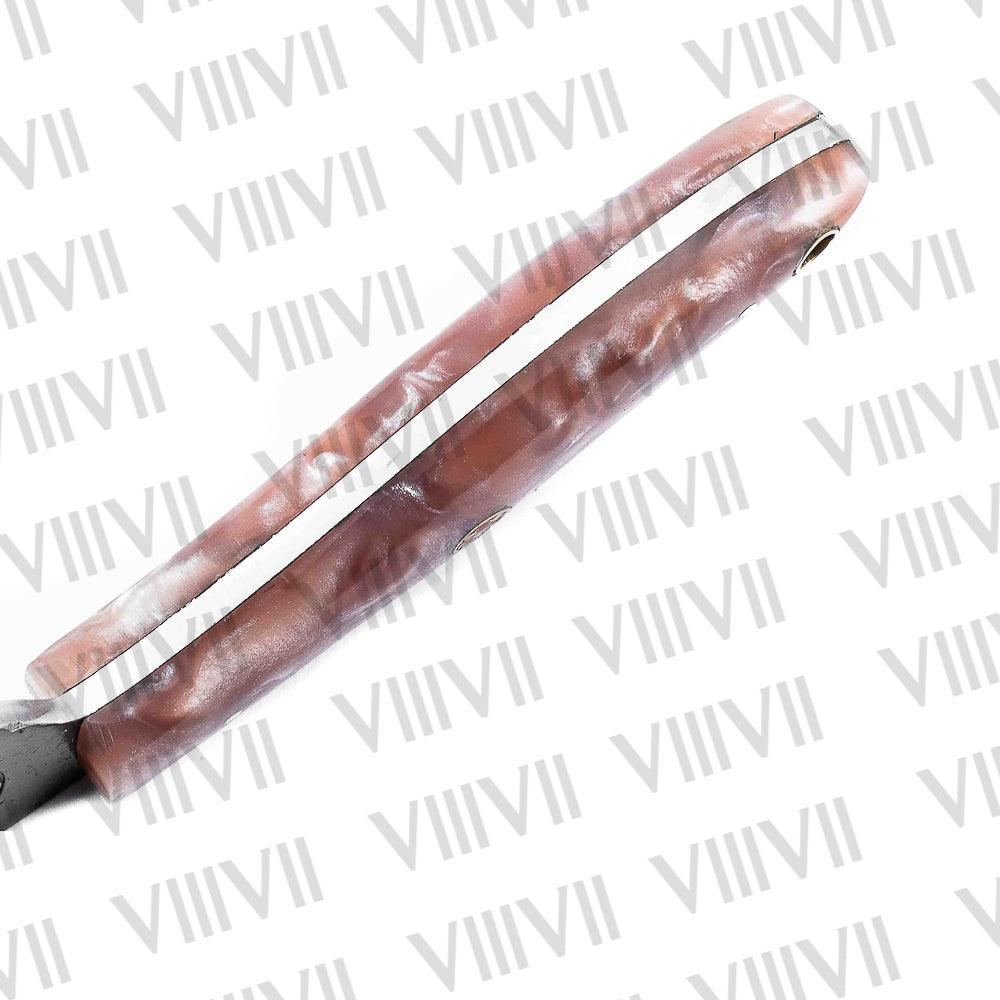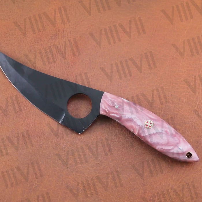 The handle is crafted from wavy pink resin, offering a unique look and excellent grip—even in wet environments. The integrated blade hole adds extra control during tough cuts, making it a versatile and trusted field companion.