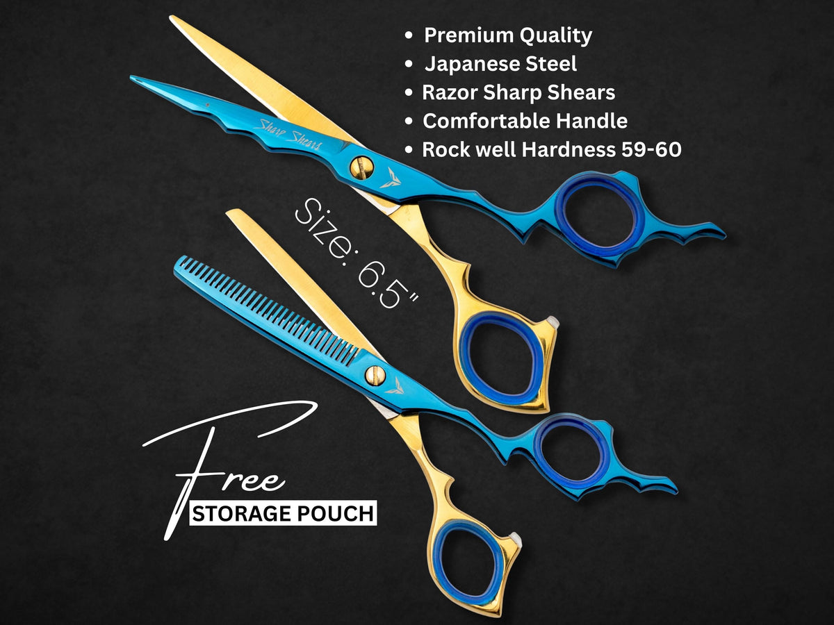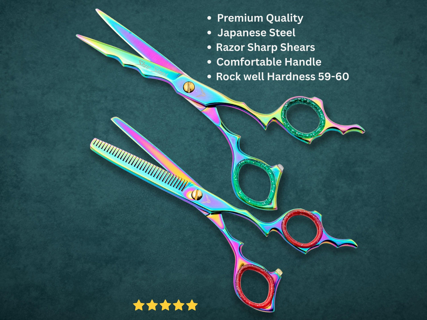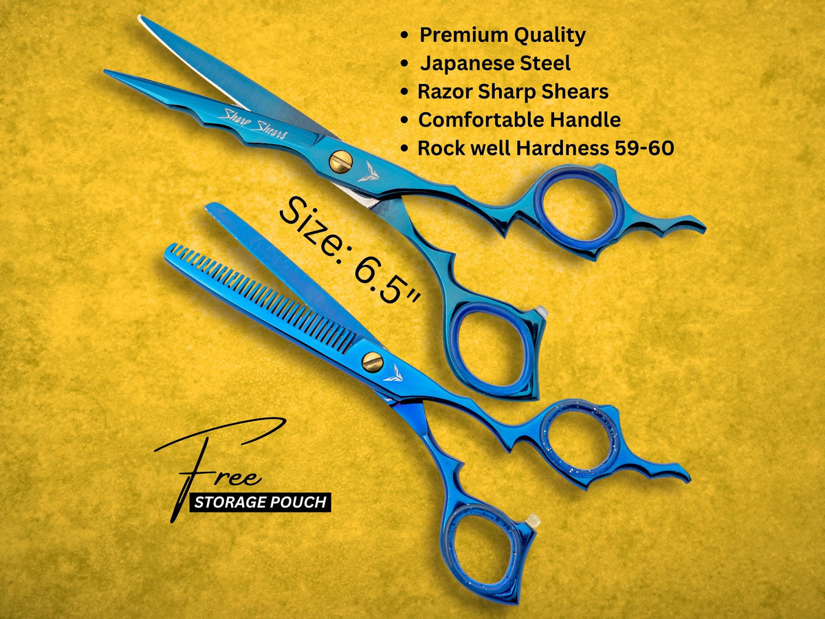 Achieve salon-quality results with this premium set of 6.5-inch Japanese Steel Hair Cutting Scissors and 33-Teeth Thinning Shears. Designed for barbers, hairdressers, stylists, and cosmetologists, this duo is engineered for precision, comfort, and long-term performance.